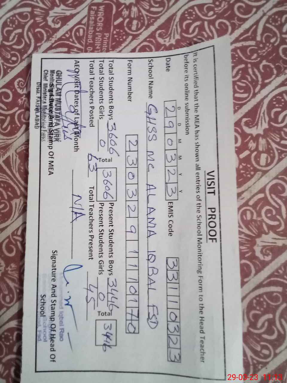| EMIS Code: 33110323 | Name of School: GHSS MC ALAMA IQBAL FSD | |||