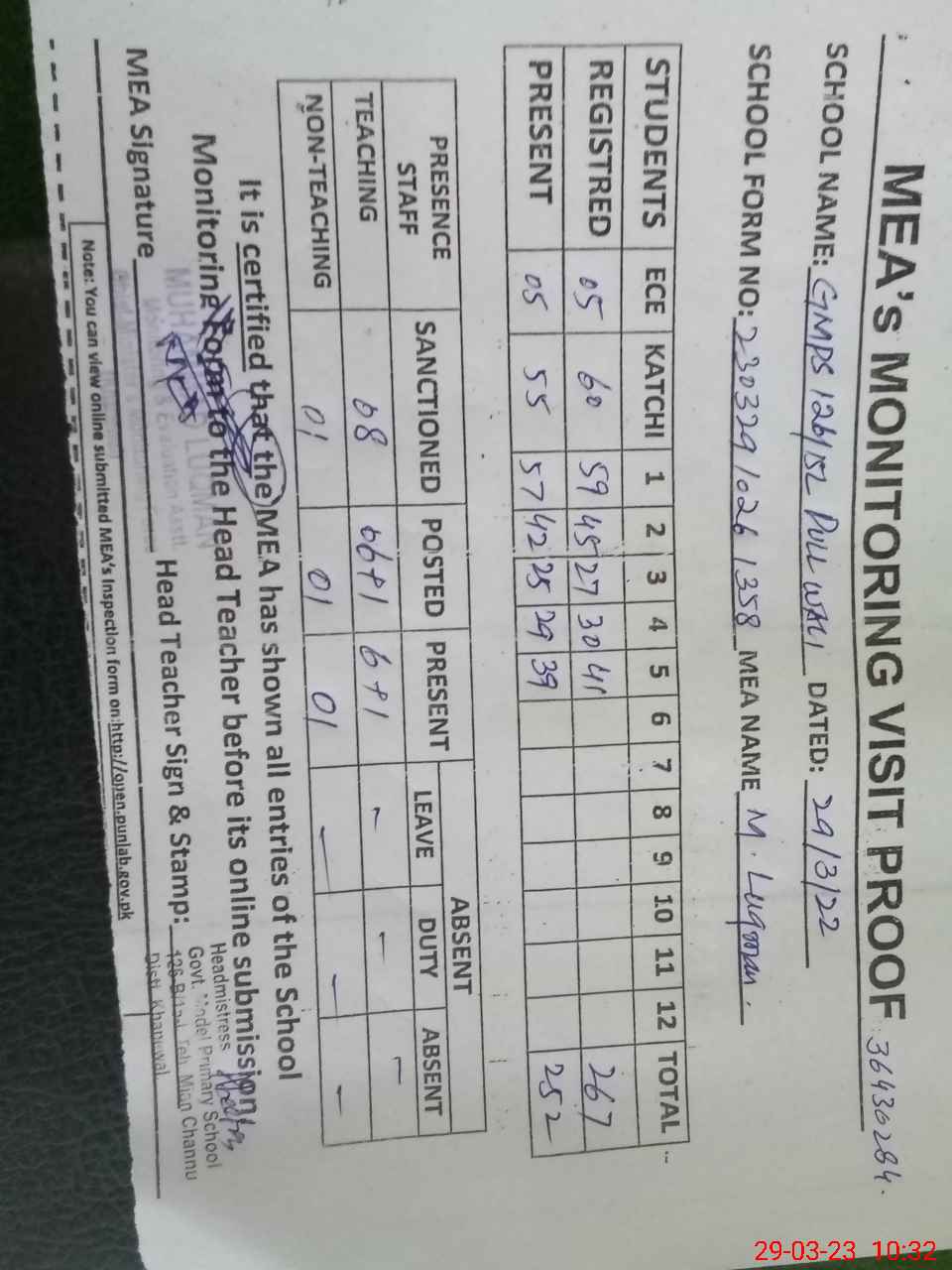 | Attendance Register | Head Teacher | MEA with School | Visit Proof |