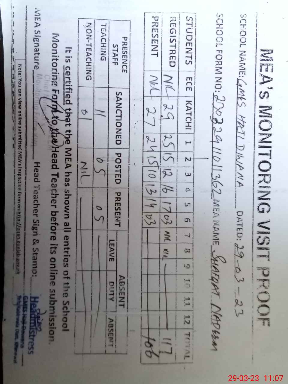 | Attendance Register | Head Teacher | MEA with School | Visit Proof |