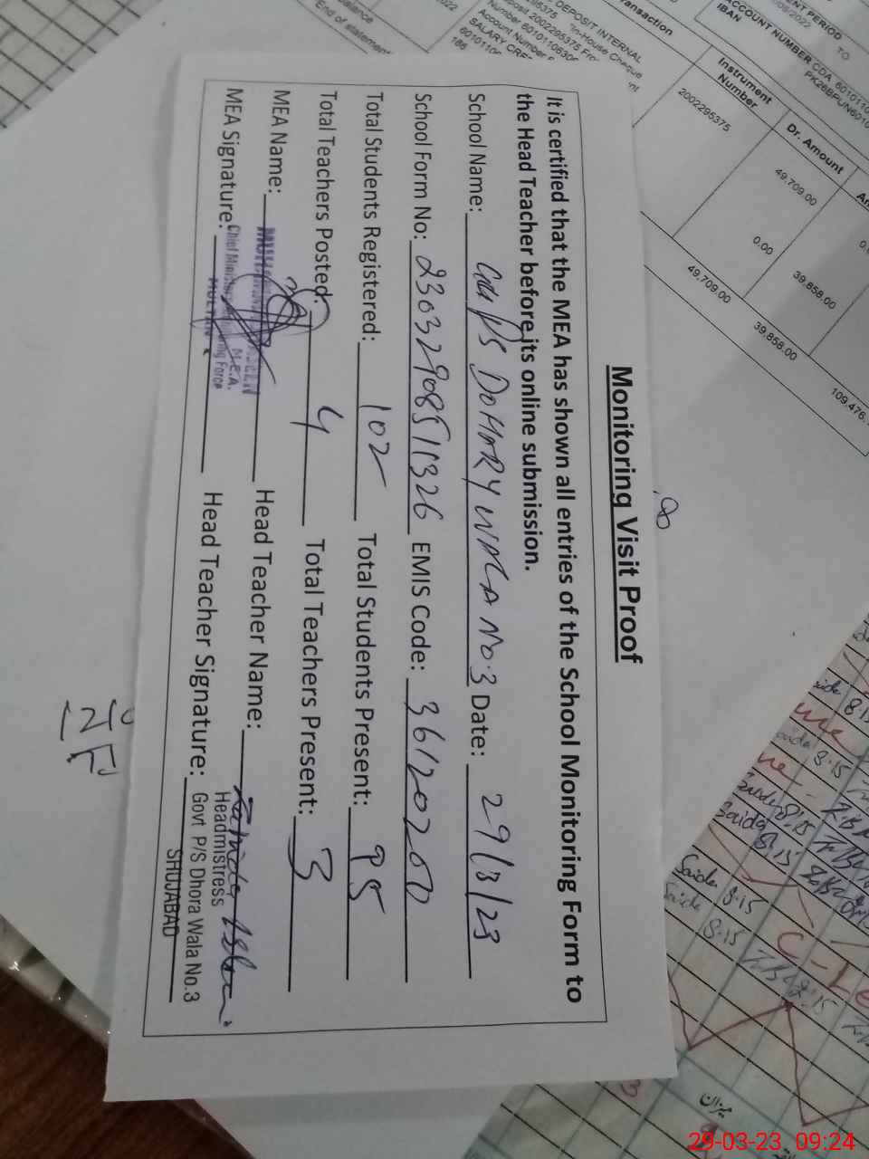 | Attendance Register | Head Teacher | MEA with School | Visit Proof |