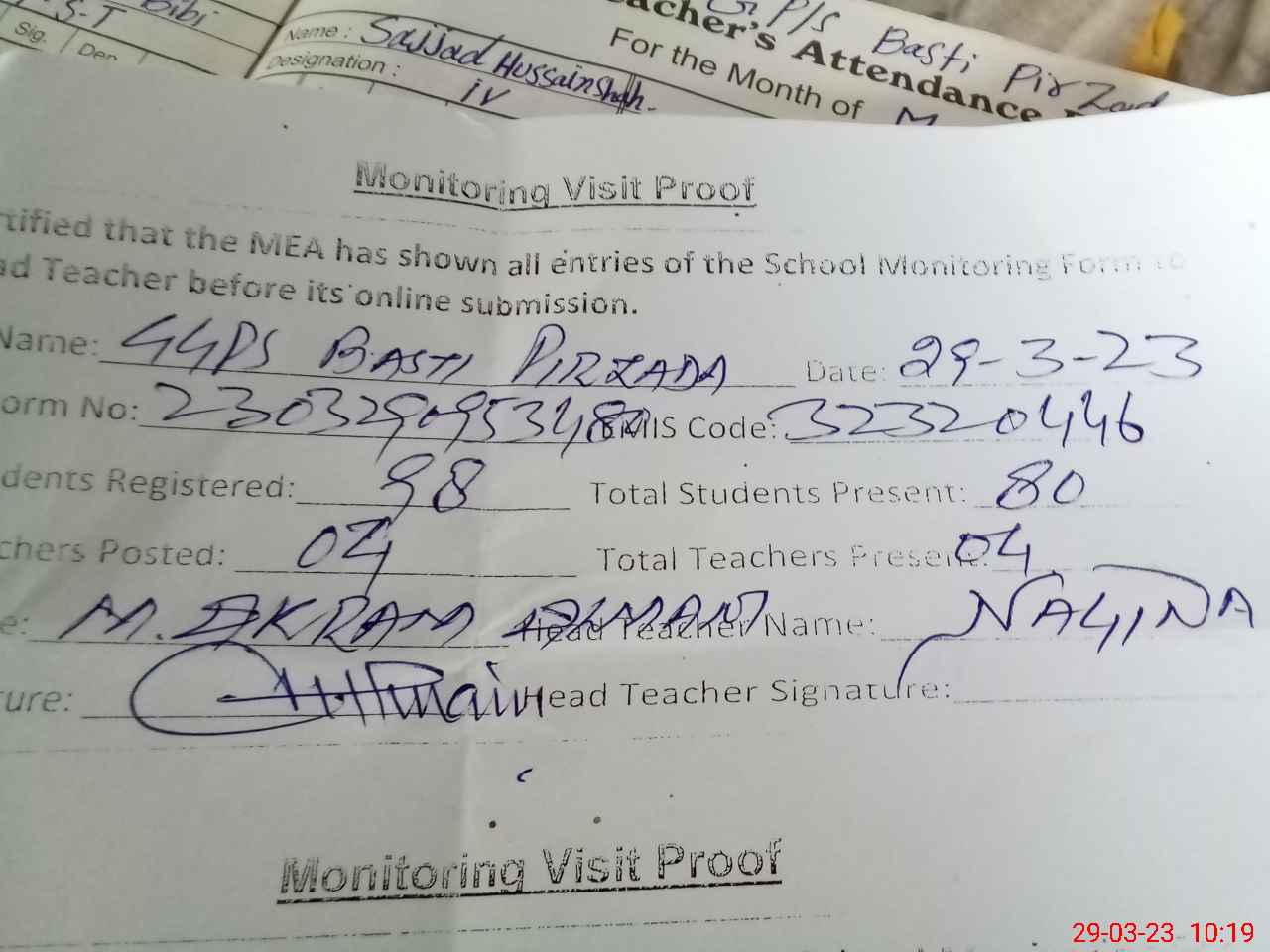 | Attendance Register | Head Teacher | MEA with School | Visit Proof |