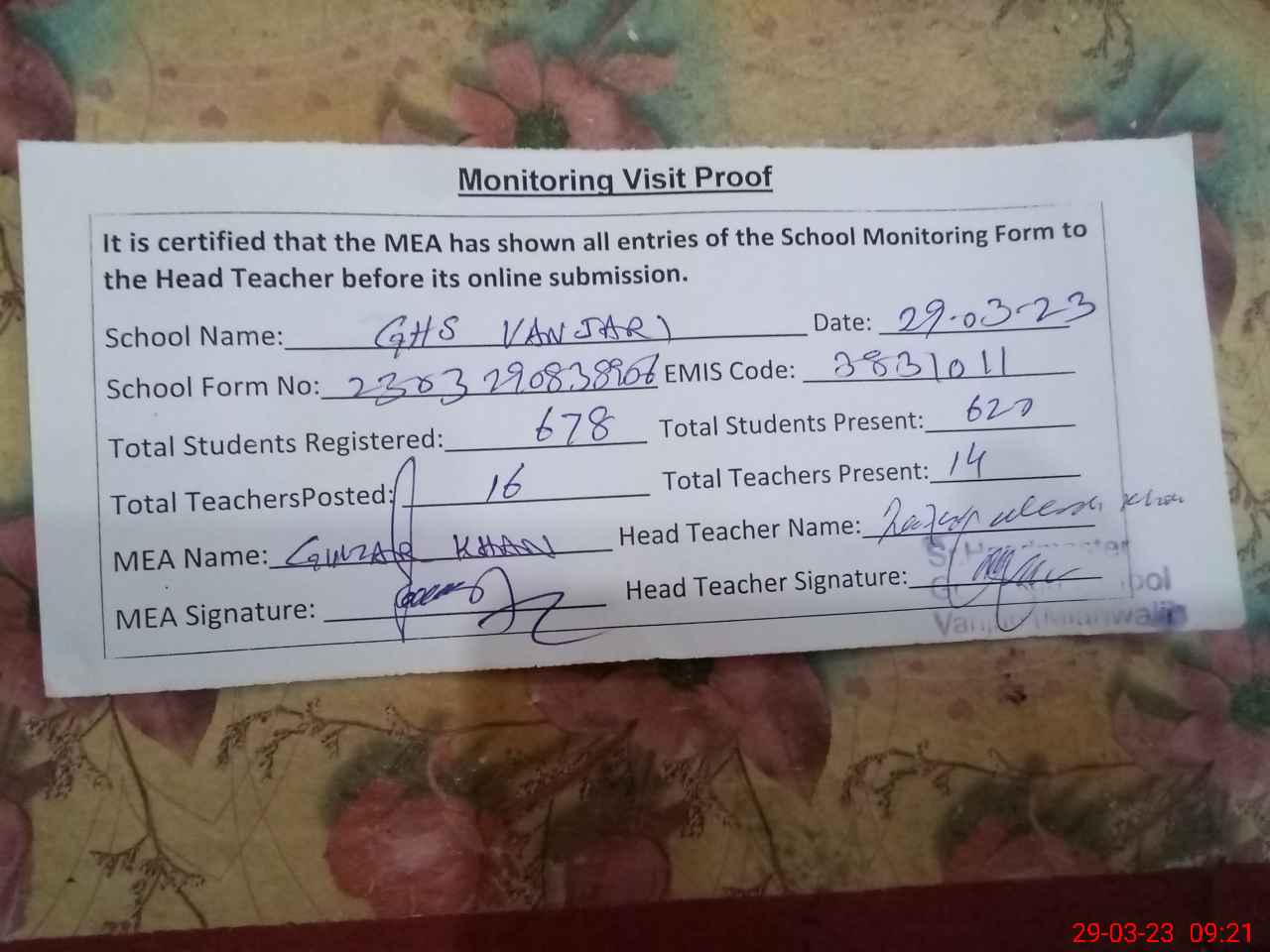 | Attendance Register | Head Teacher | MEA with School | Visit Proof |