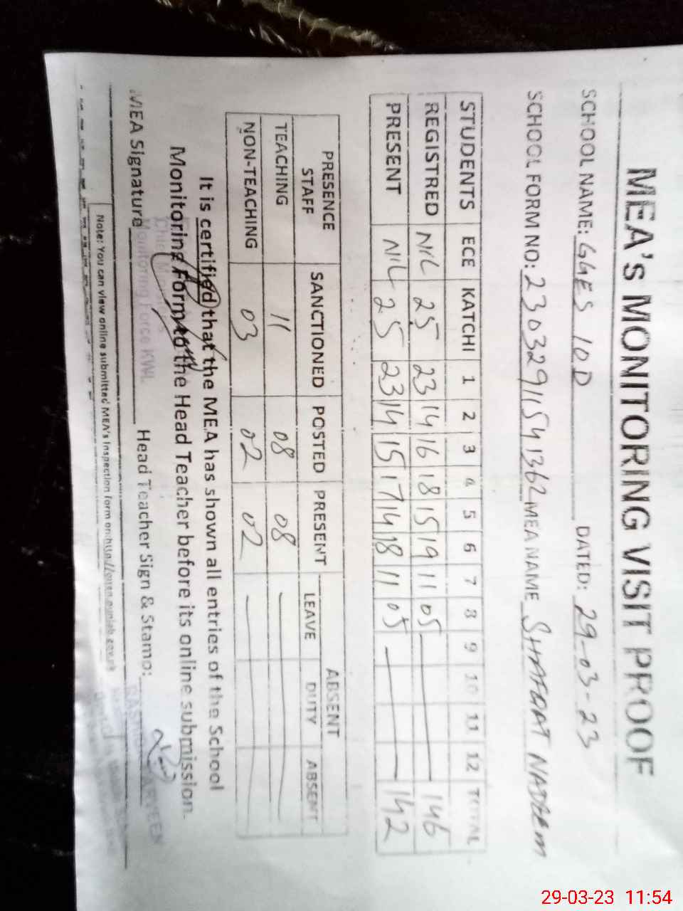 | Attendance Register | Head Teacher | MEA with School | Visit Proof |