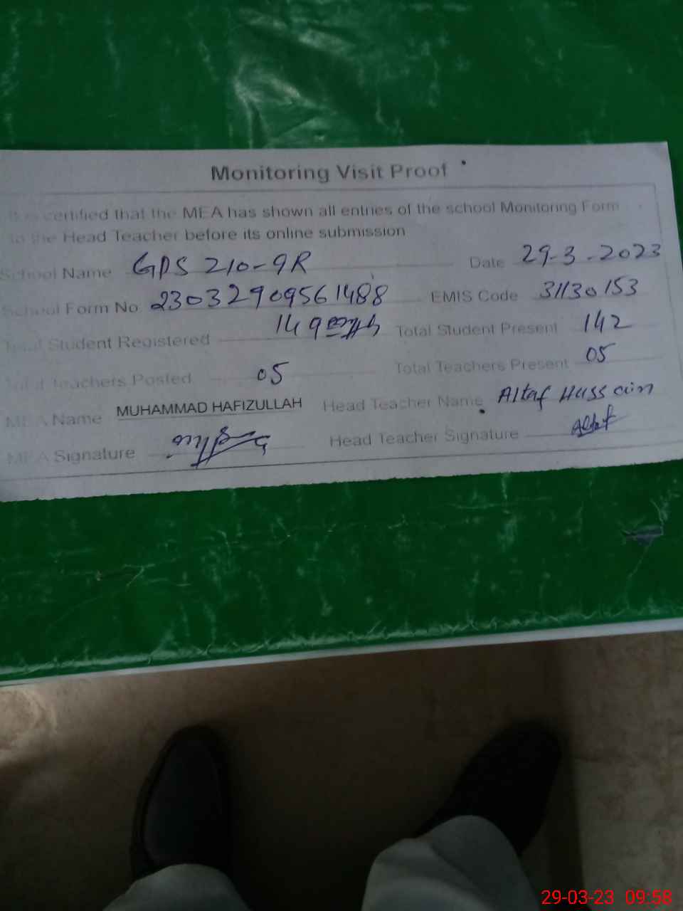 | Attendance Register | Head Teacher | MEA with School | Visit Proof |