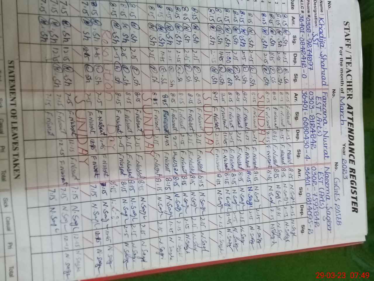 | Name: KH**** SH**** Designation: (School Headmaster's/Headmistress's) S.S.T.(GENERAL) Phone/Cell Number: 03**** |