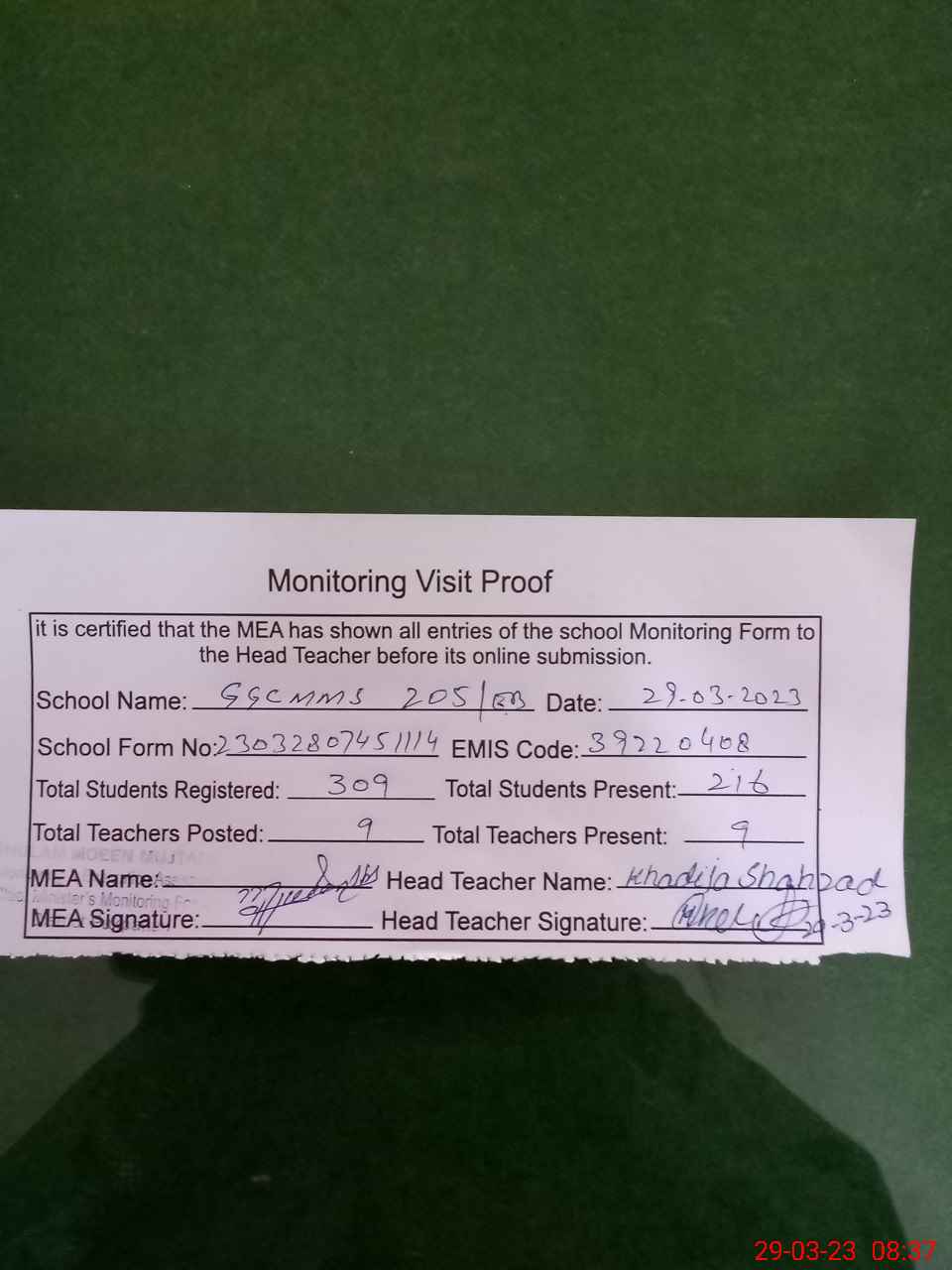 | Attendance Register | Head Teacher | MEA with School | Visit Proof |