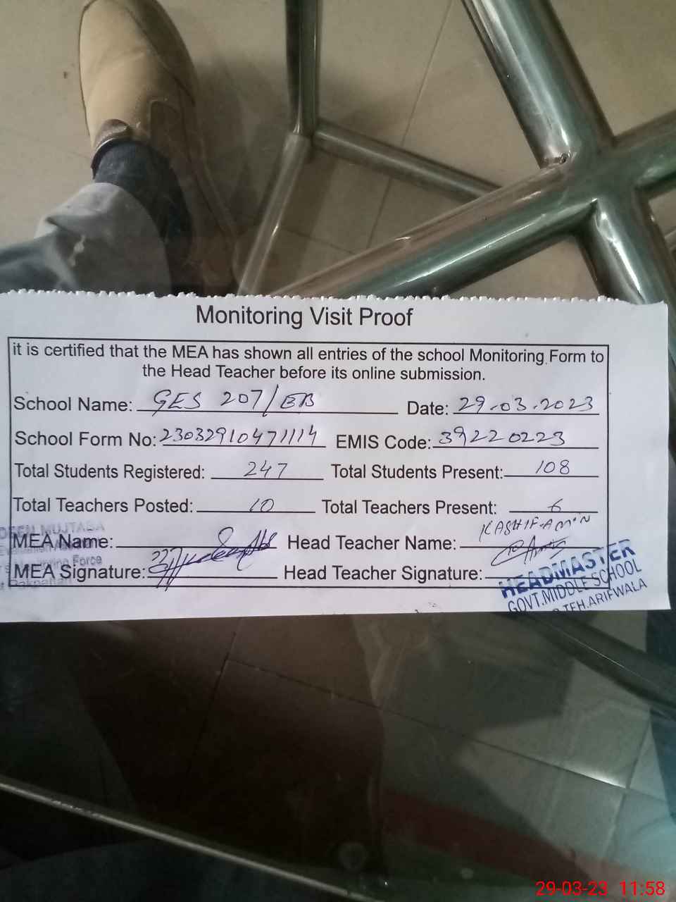 | EMIS Code: 39220223 | Name of School: GES CHAK NO. 207 EB P.O SAME ARIF WALA | |||