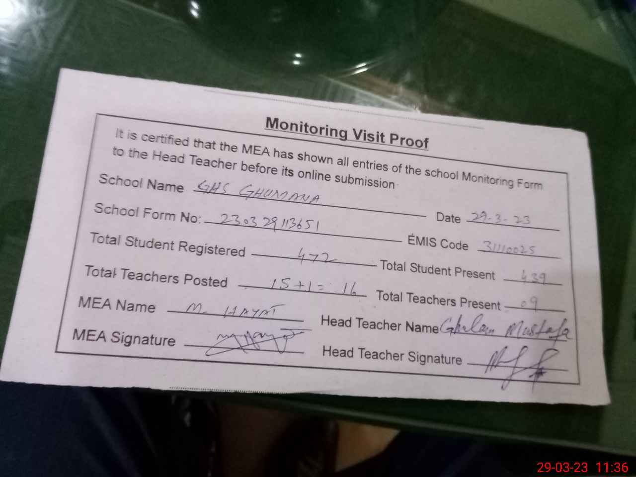 | EMIS Code: 31110025 | Name of School: GHS CHAK GHUMANA | |||