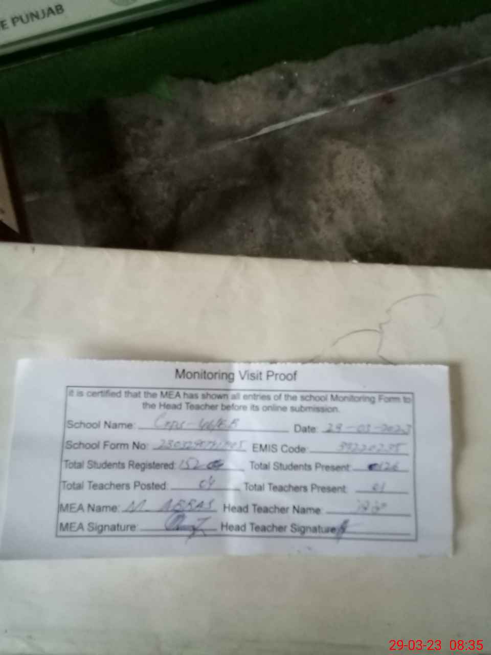 | Attendance Register | Head Teacher | MEA with School | Visit Proof |