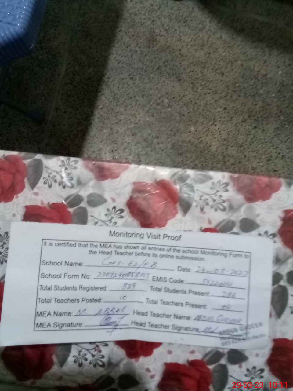 | Certified that this School was Inspected by the Undersigned MEA/DMO Today and the Information Stated Above is as Per Record. | |||||