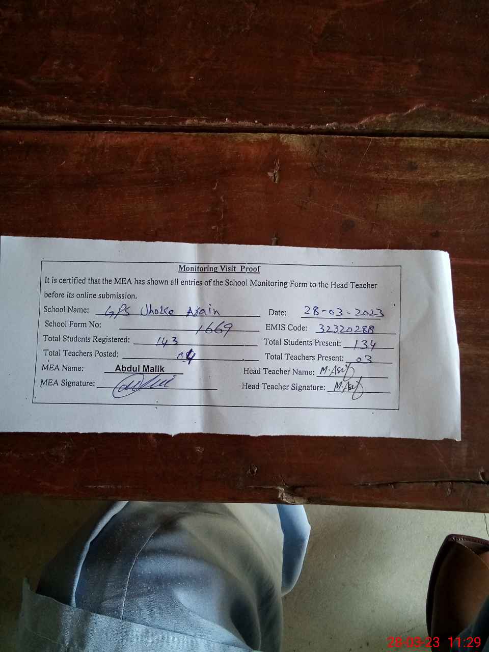 | EMIS Code: 32320288 | Name of School: GPS JHOKE ARAIN | |||