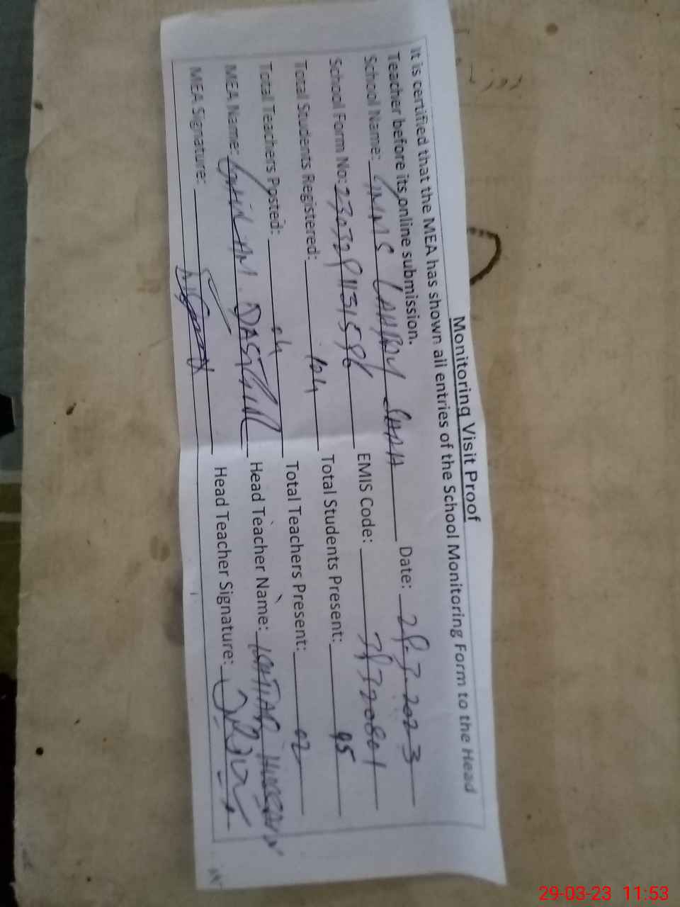 | Attendance Register | Head Teacher | MEA with School | Visit Proof |