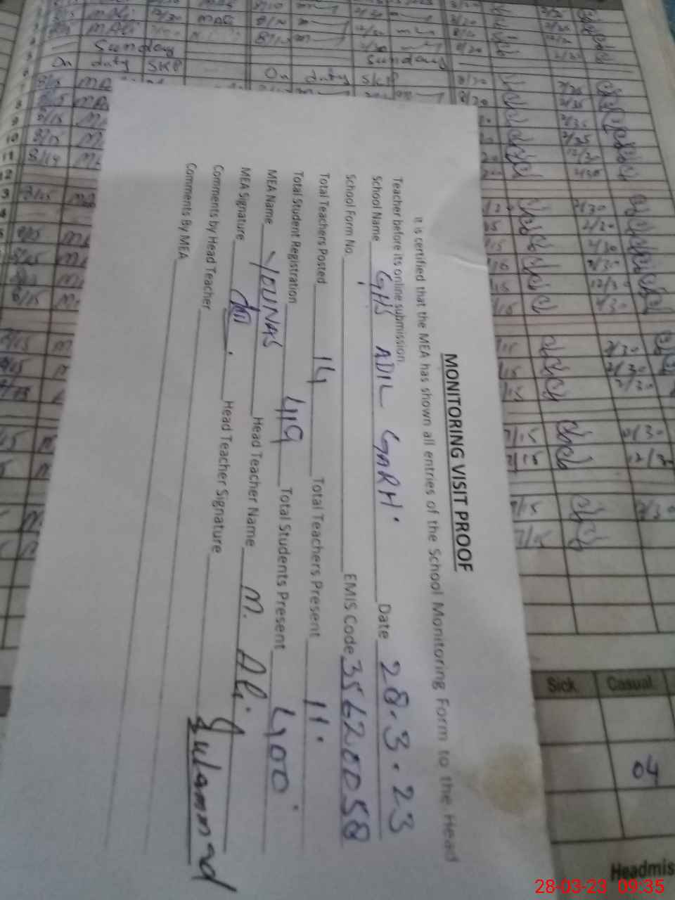 | Attendance Register | Head Teacher | MEA with School | Visit Proof |
