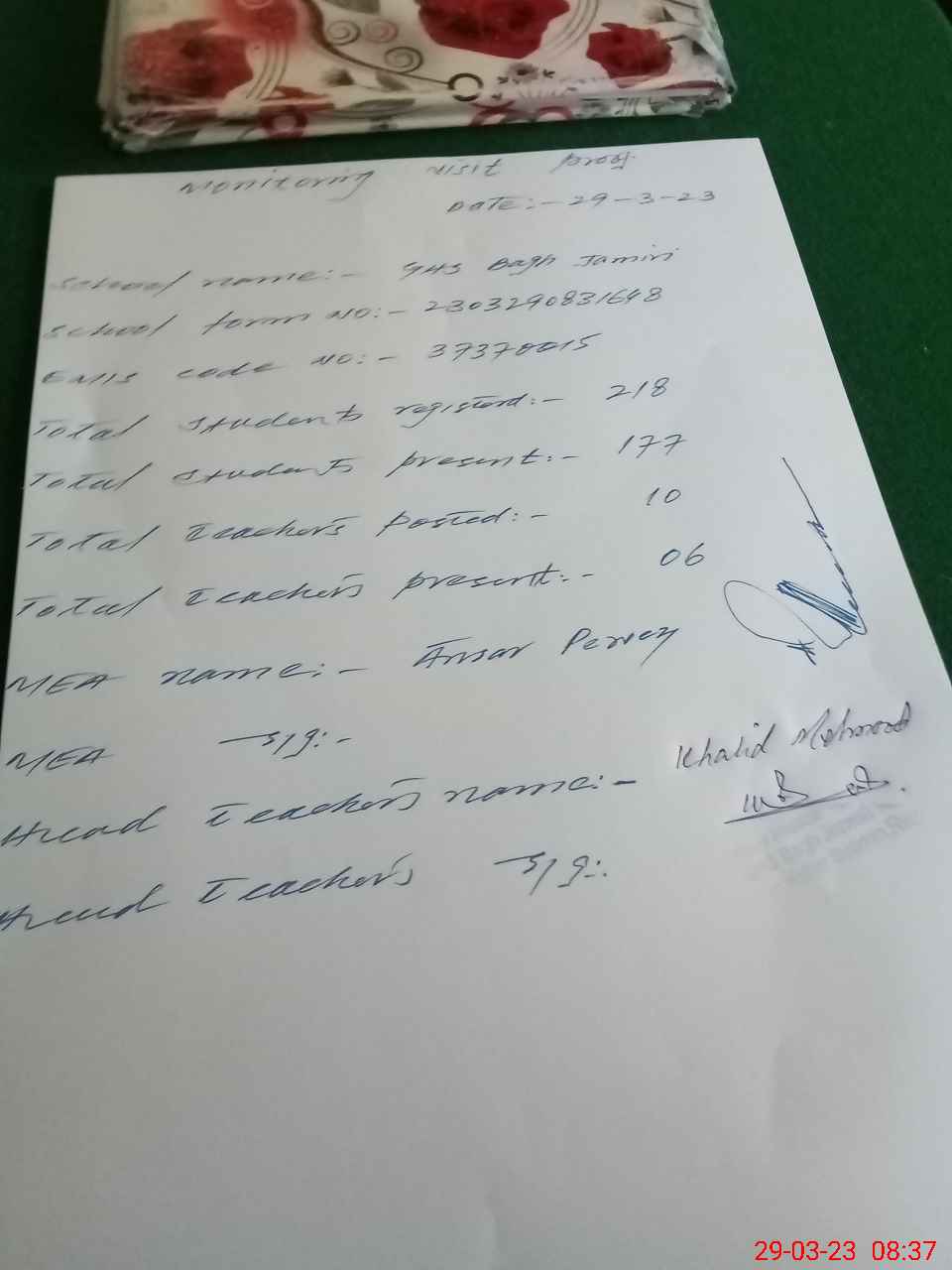 | Name: KH**** ME**** Designation: (School Headmaster's/Headmistress's) Headmaster Phone/Cell Number: 03**** |