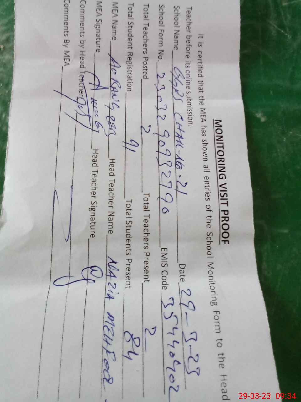 | Attendance Register | Head Teacher | MEA with School | Visit Proof |