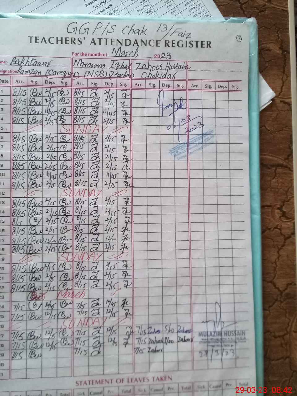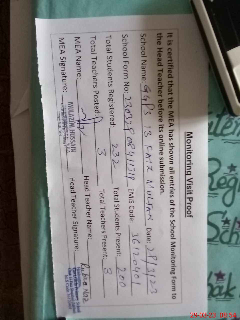| Attendance Register | Head Teacher | MEA with School | Visit Proof |