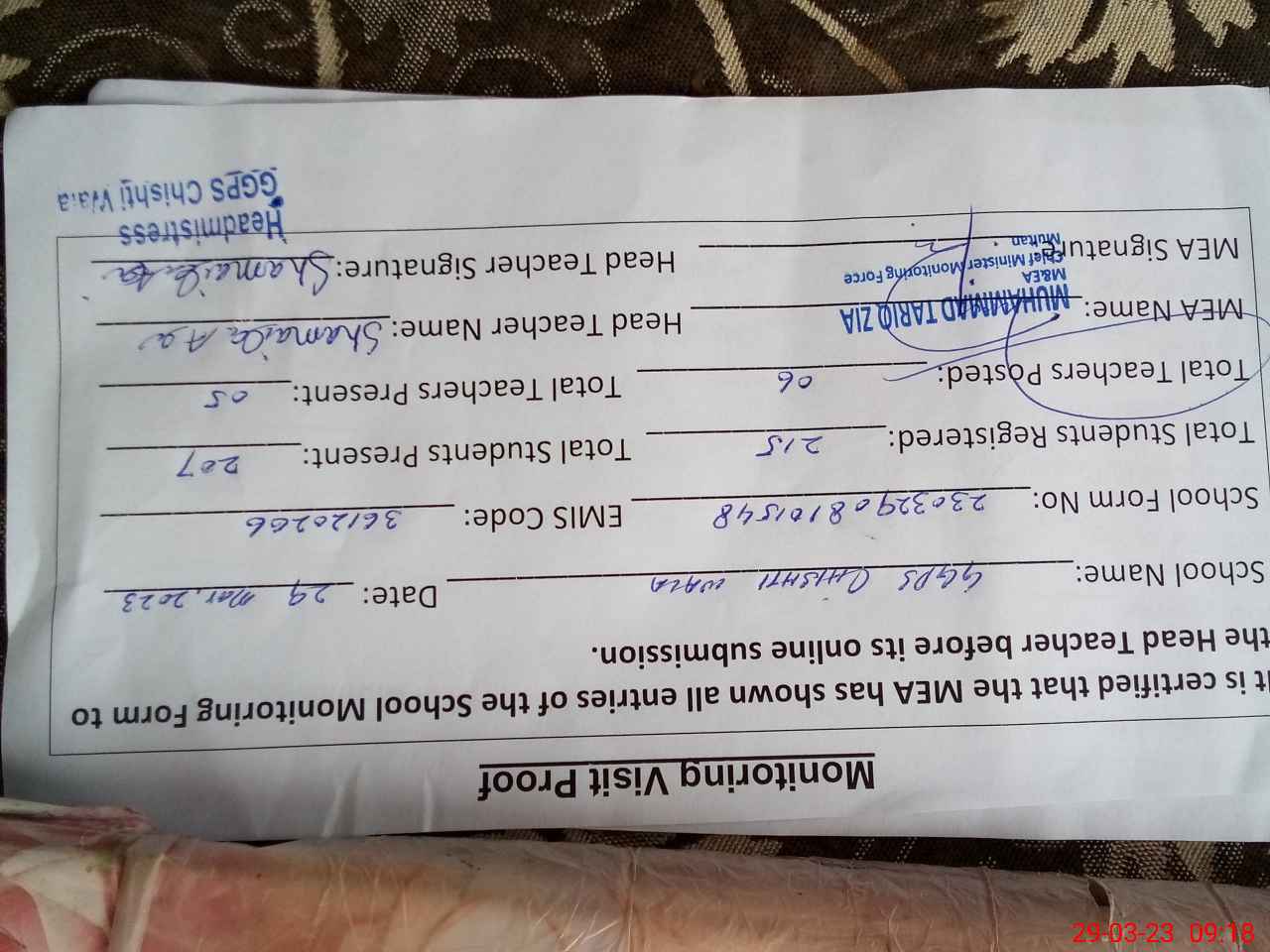 | Name: Sa**** Pa**** Designation: (School Headmaster's/Headmistress's) HM Phone/Cell Number: 03**** |