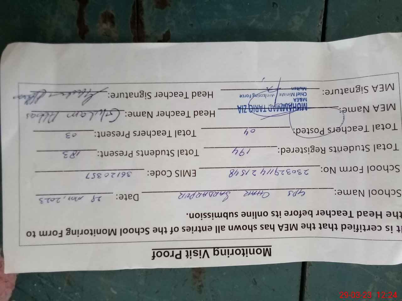 | Attendance Register | Head Teacher | MEA with School | Visit Proof |