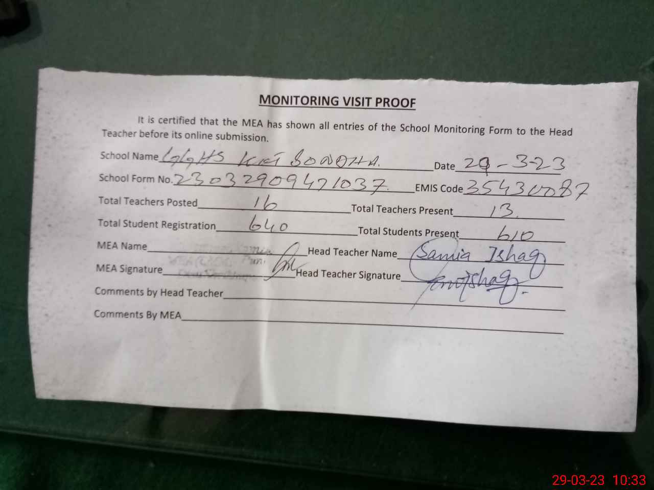 | Attendance Register | Head Teacher | MEA with School | Visit Proof |