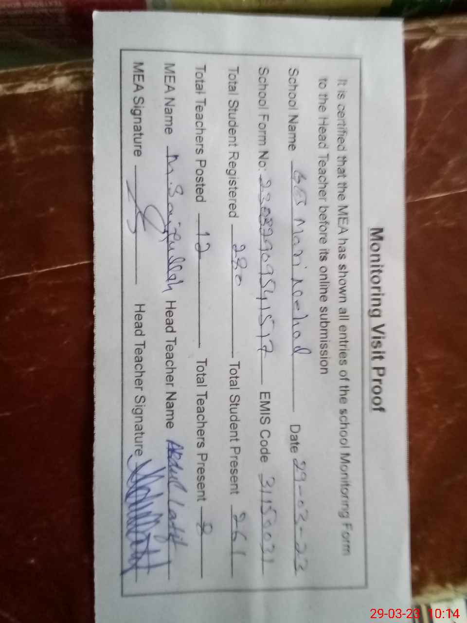 | Attendance Register | Head Teacher | MEA with School | Visit Proof |
