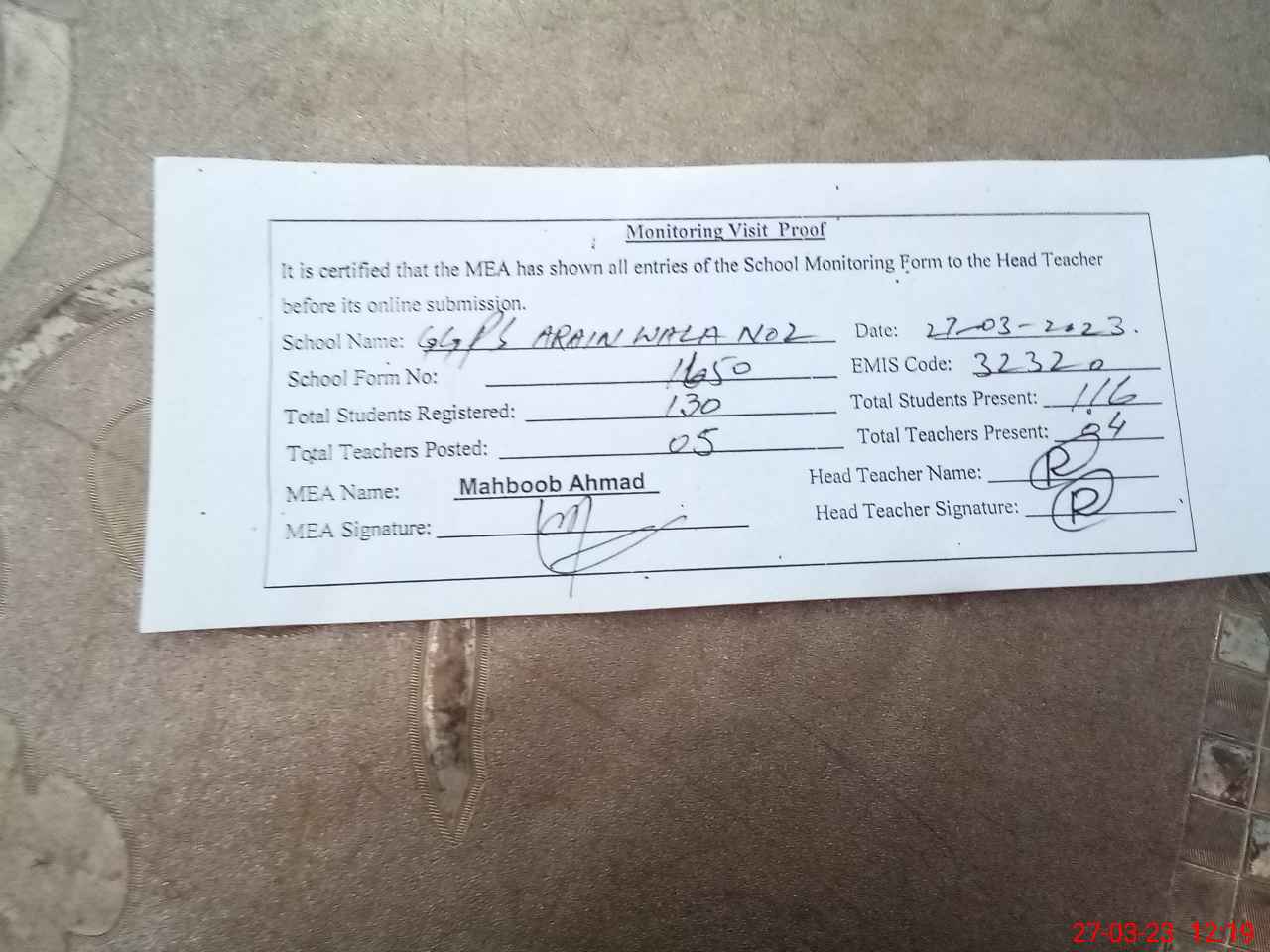 | Attendance Register | Head Teacher | MEA with School | Visit Proof |