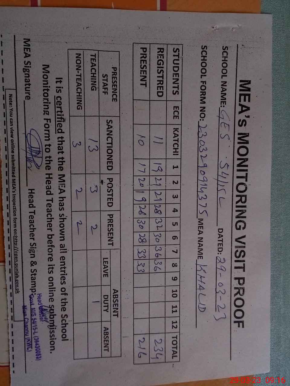 | Attendance Register | Head Teacher | MEA with School | Visit Proof |