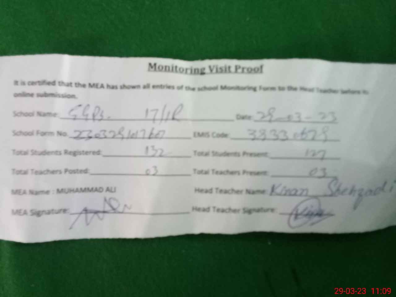 | Attendance Register | Head Teacher | MEA with School | Visit Proof |