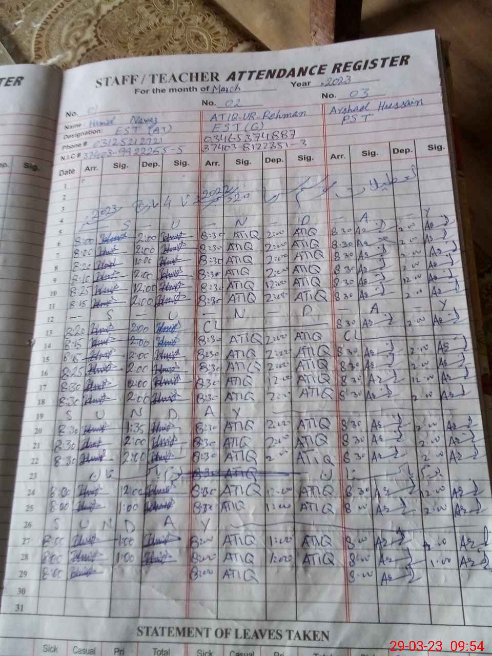| CNIC | Full Name | Designation | R/C | Absence During Last Calender Month |