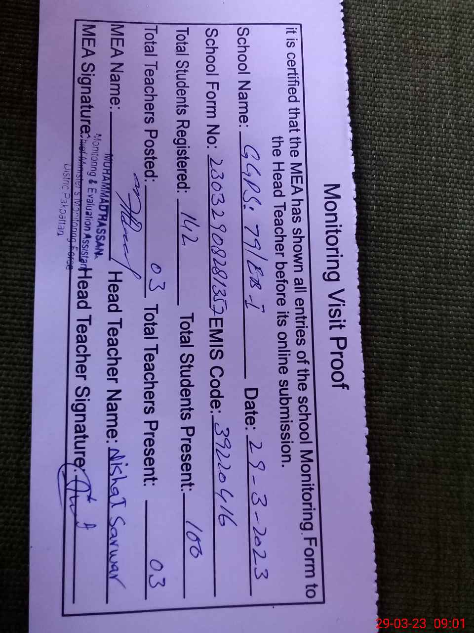 | EMIS Code: 39220416 | Name of School: GGPS 79/EB-I ARIFWALA | |||