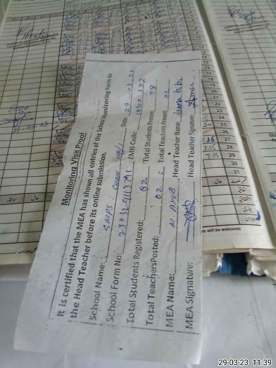 | Attendance Register | Head Teacher | MEA with School | Visit Proof |