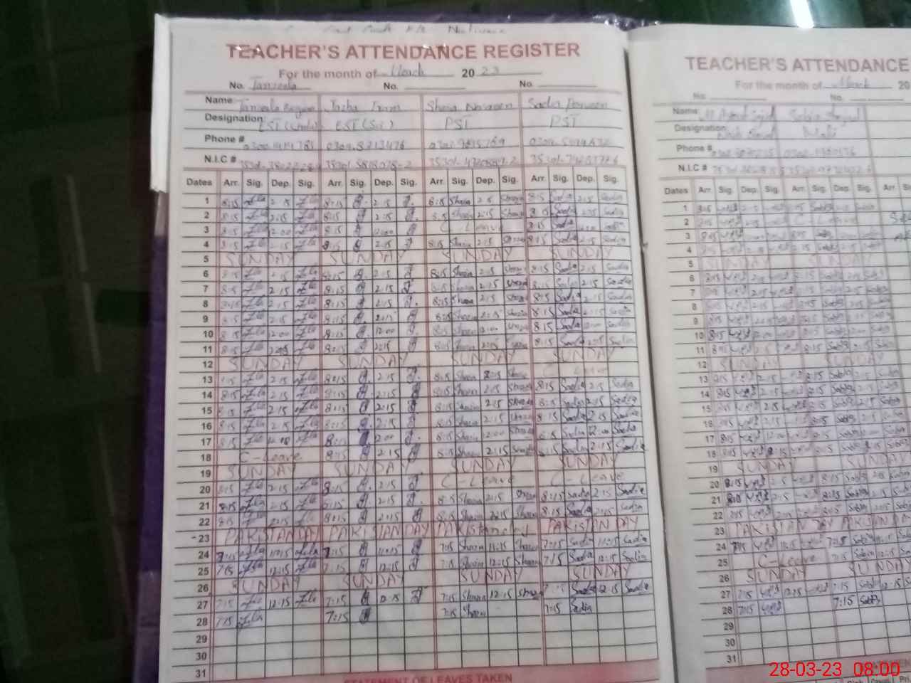 | CNIC | Full Name | Designation | R/C | Absence During Last Calender Month |