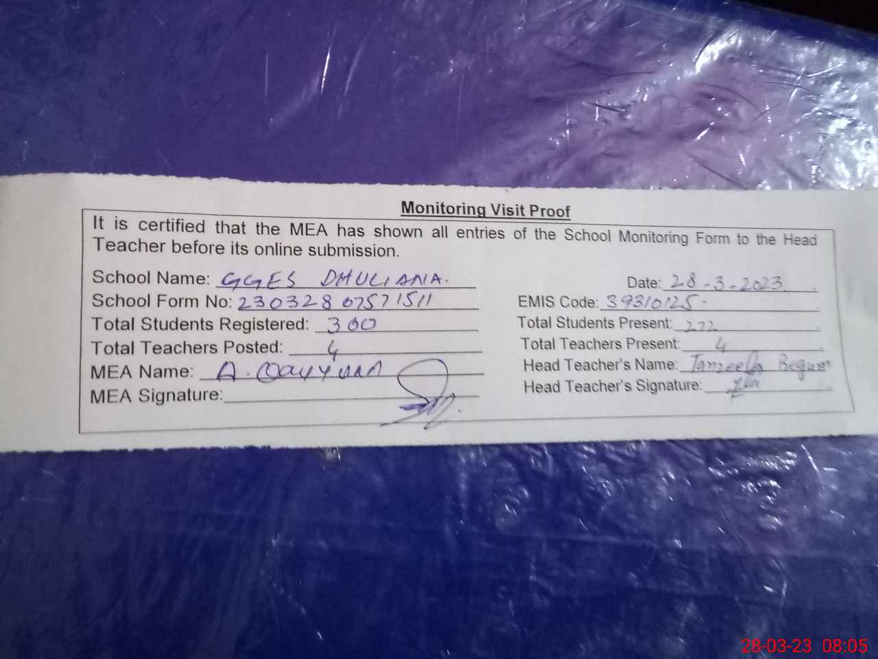 | Attendance Register | Head Teacher | MEA with School | Visit Proof |