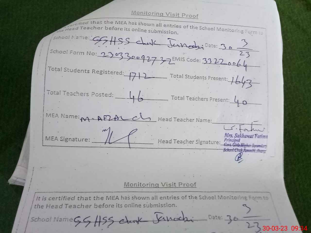 | Attendance Register | Head Teacher | MEA with School | Visit Proof |