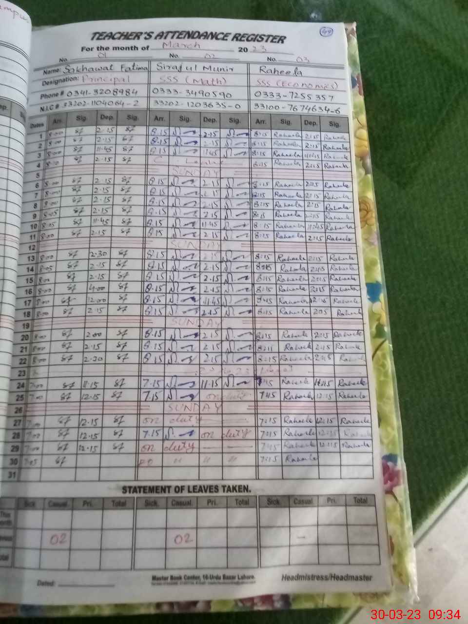| Name: FA**** IR**** Designation: (School Headmaster's/Headmistress's) PRINCIPAL Phone/Cell Number: 03**** |