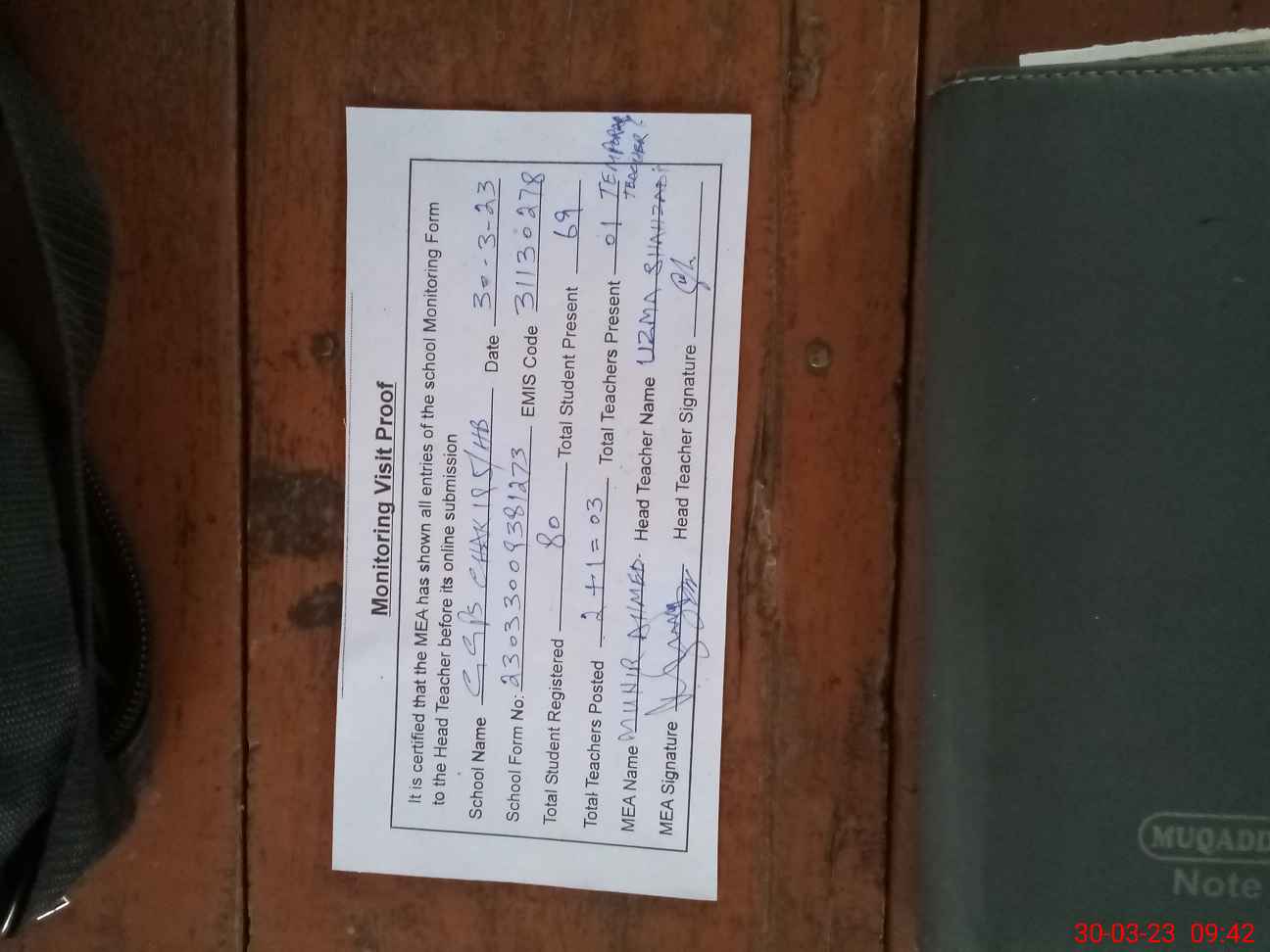 | Attendance Register | Head Teacher | MEA with School | Visit Proof |