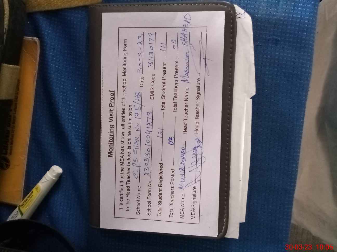 | Attendance Register | Head Teacher | MEA with School | Visit Proof |