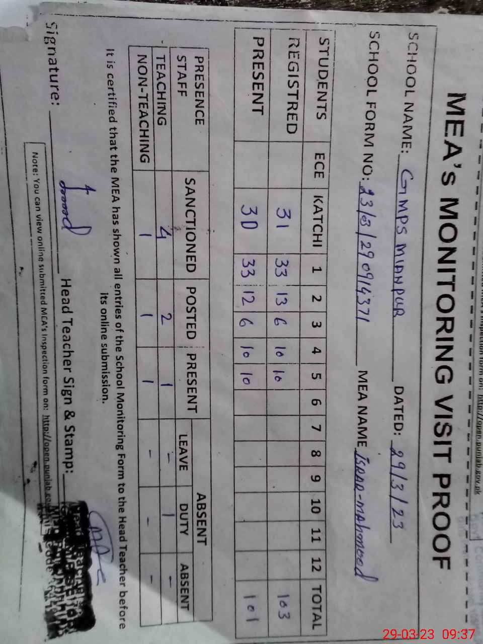 | Attendance Register | Head Teacher | MEA with School | Visit Proof |