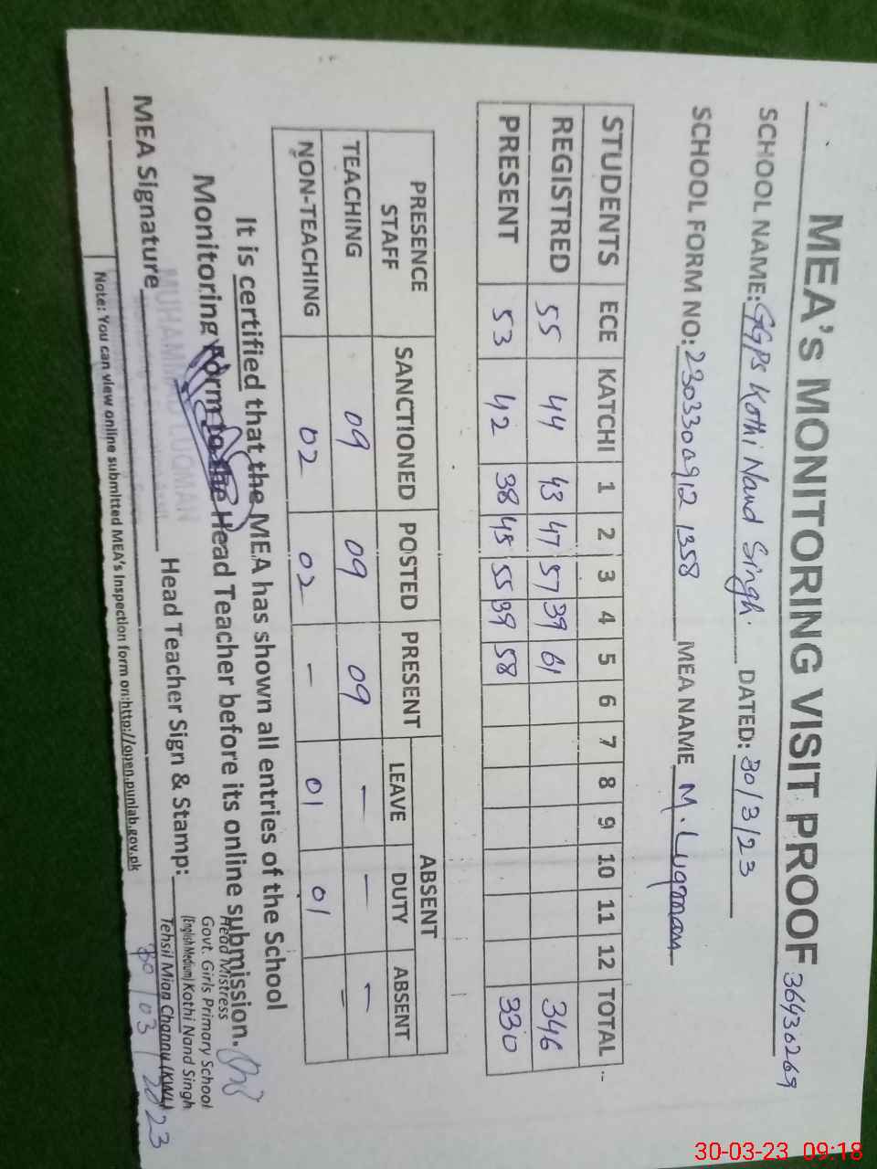 | EMIS Code: 36430269 | Name of School: GGPS KOTHI NAND SINGH, MIAN CHANNU | |||