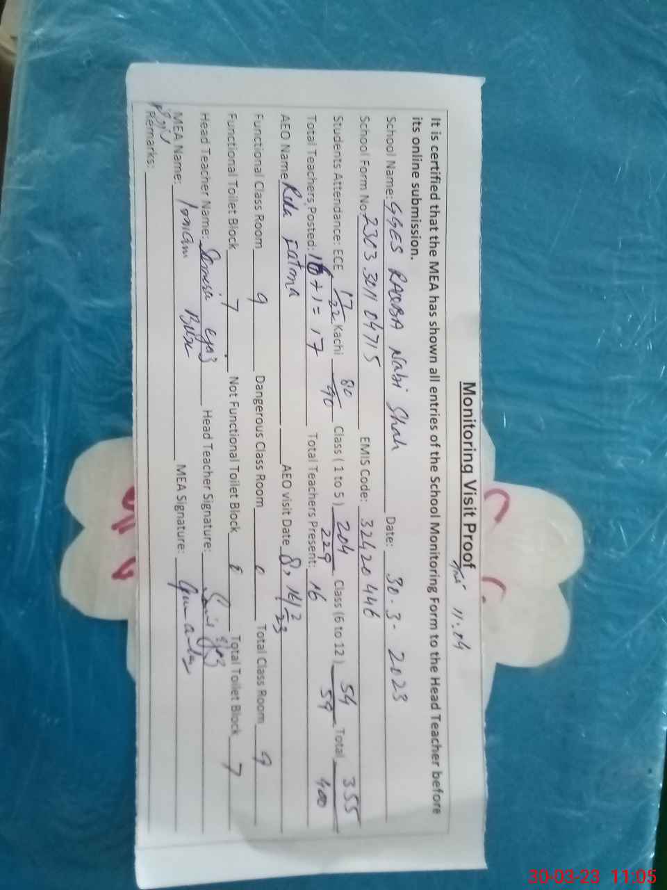 | Attendance Register | Head Teacher | MEA with School | Visit Proof |