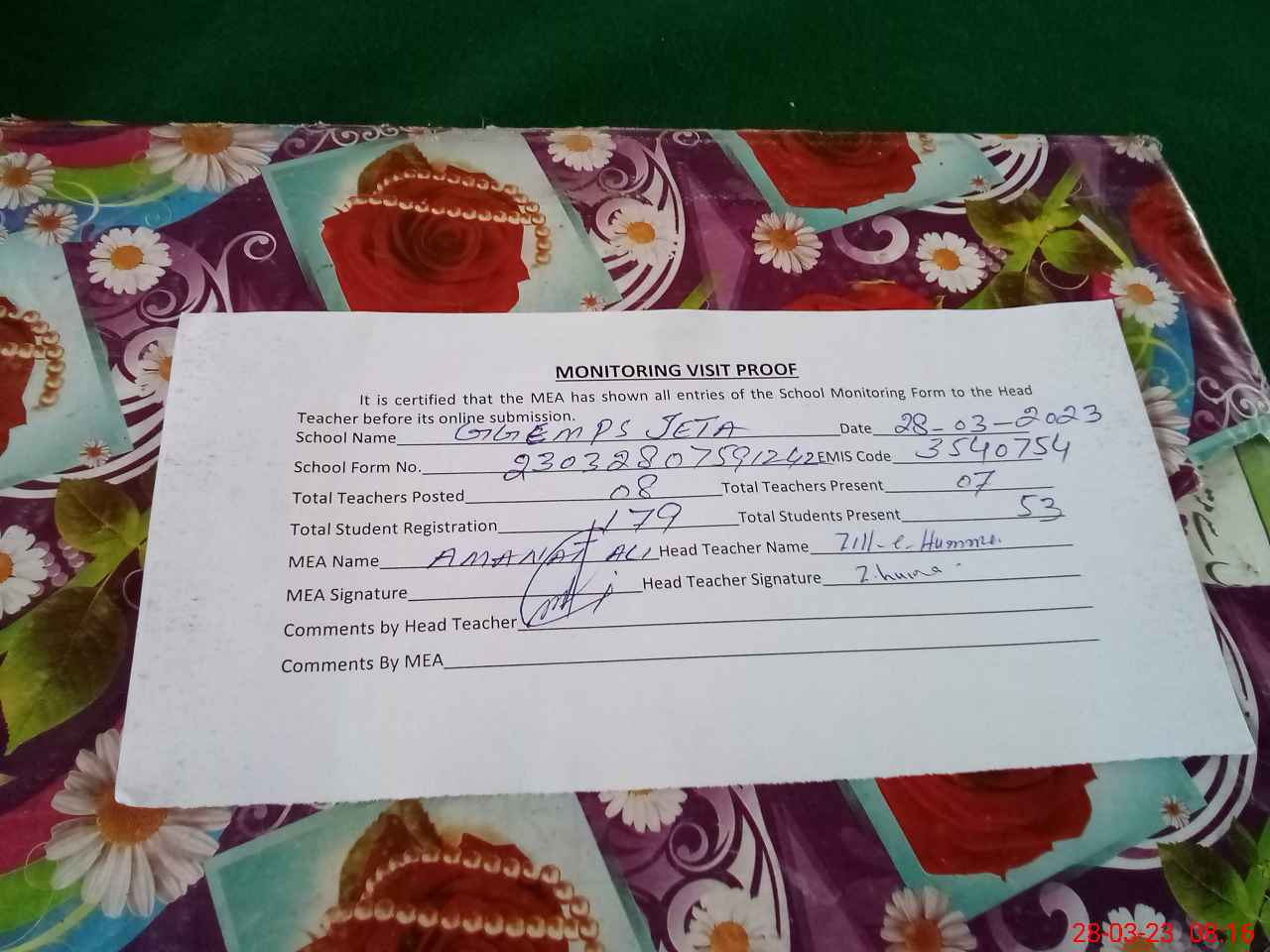 | Attendance Register | Head Teacher | MEA with School | Visit Proof |