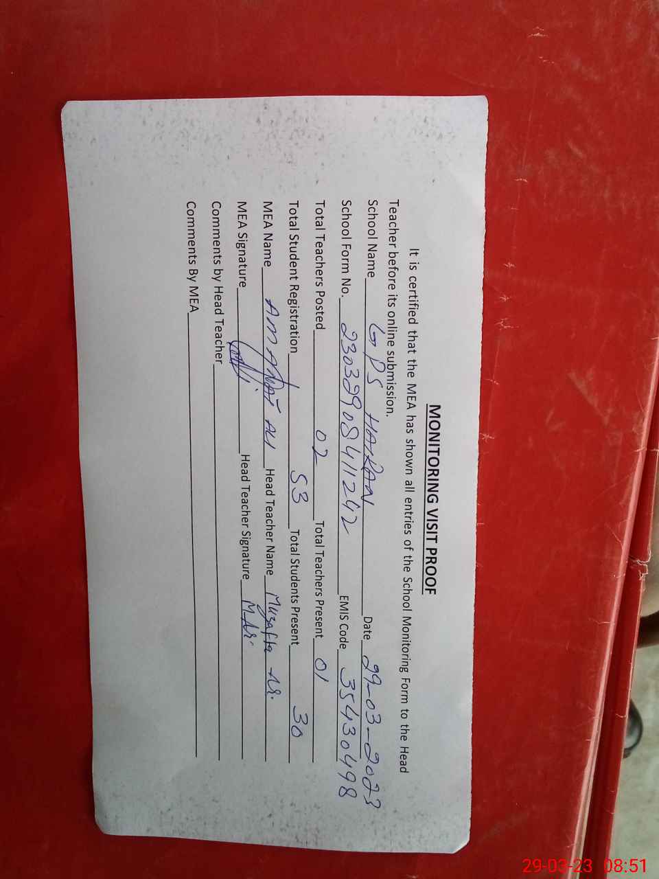 | Attendance Register | Head Teacher | MEA with School | Visit Proof |