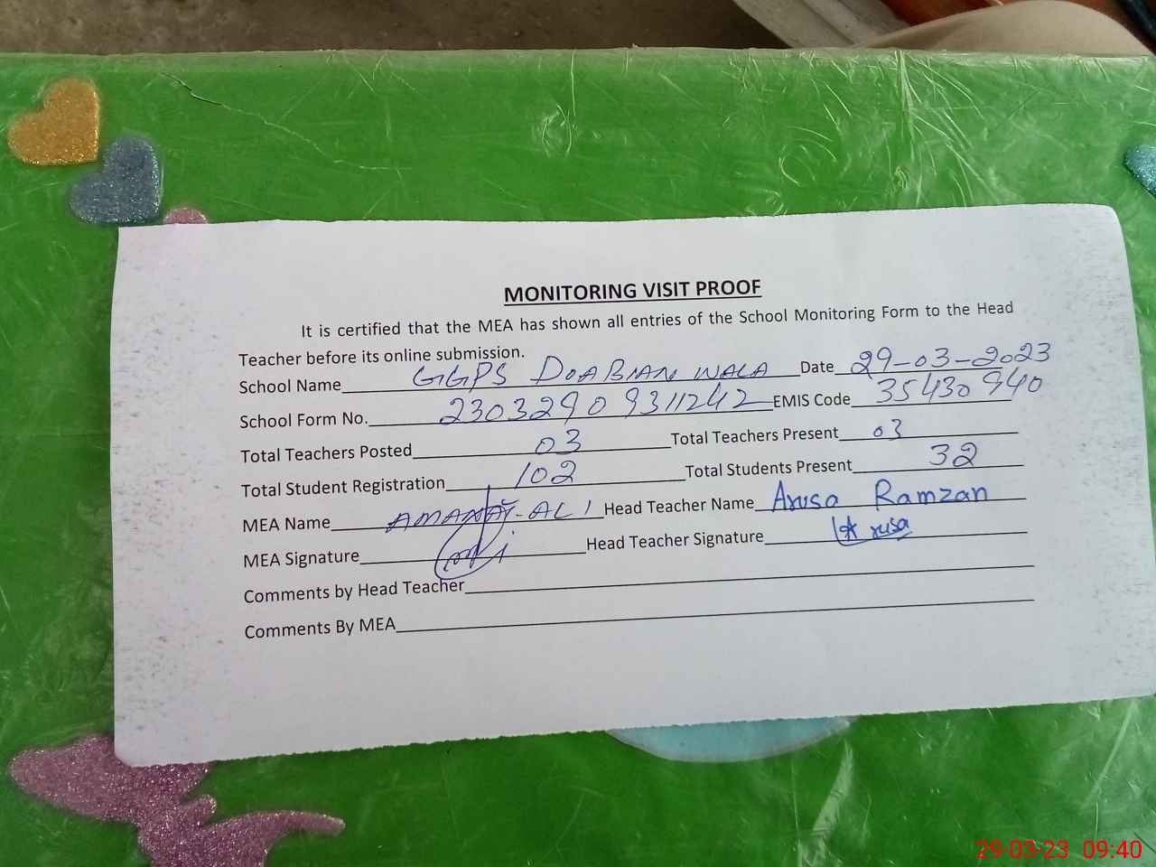 | Attendance Register | Head Teacher | MEA with School | Visit Proof |