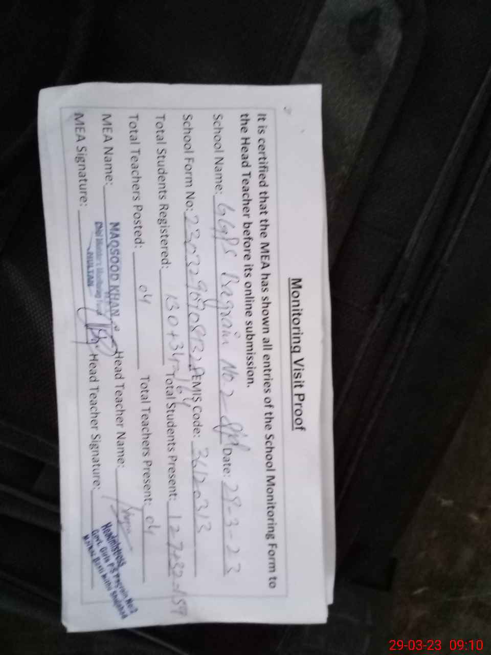 | Attendance Register | Head Teacher | MEA with School | Visit Proof |