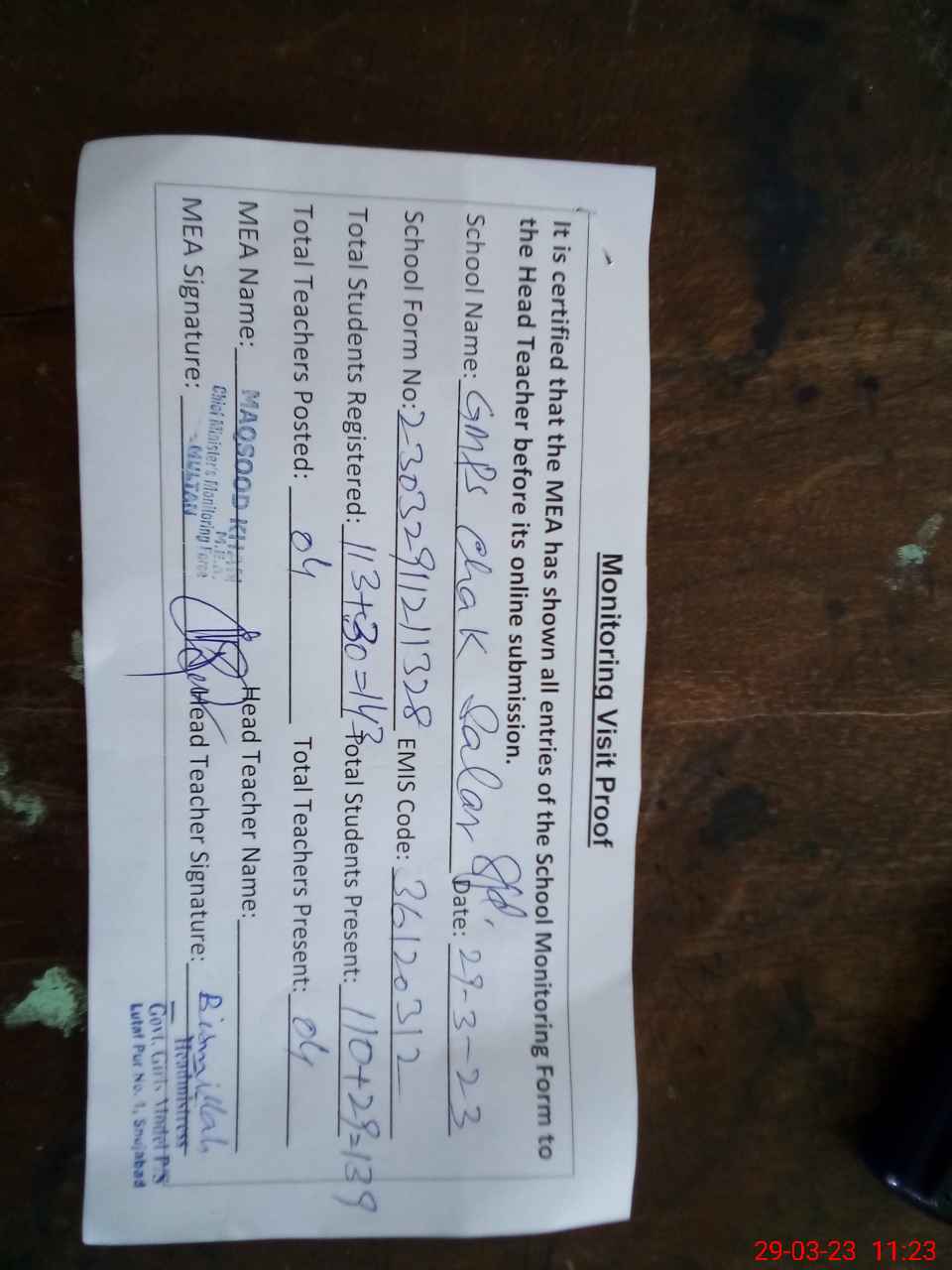 | Attendance Register | Head Teacher | MEA with School | Visit Proof |