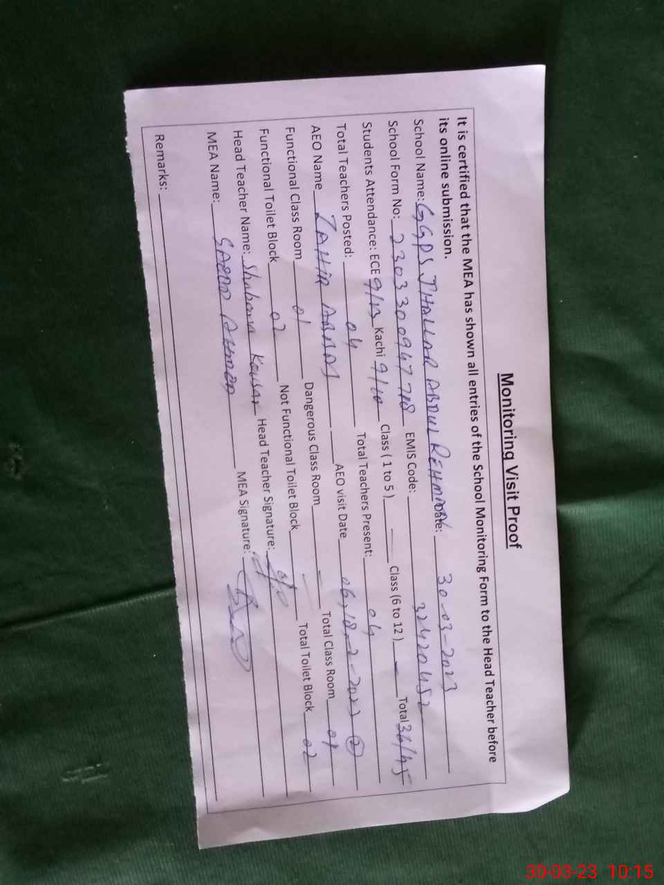 | Remarks (Use Separate Page if Required): School cleaning is good | |||||