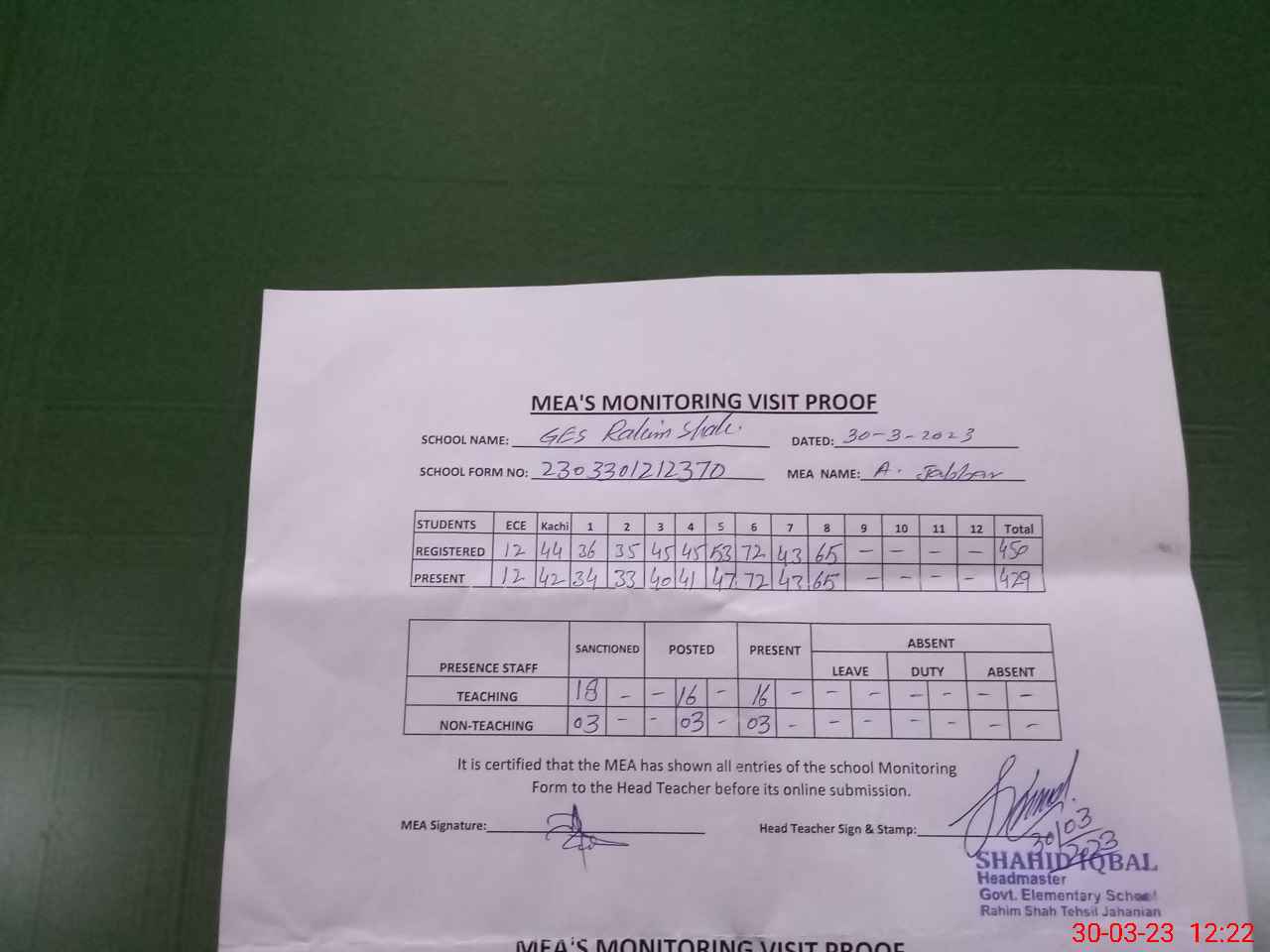 | Attendance Register | Head Teacher | MEA with School | Visit Proof |