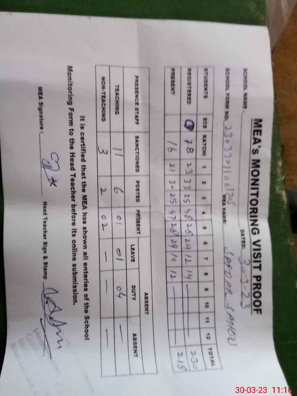 | Attendance Register | Head Teacher | MEA with School | Visit Proof |
