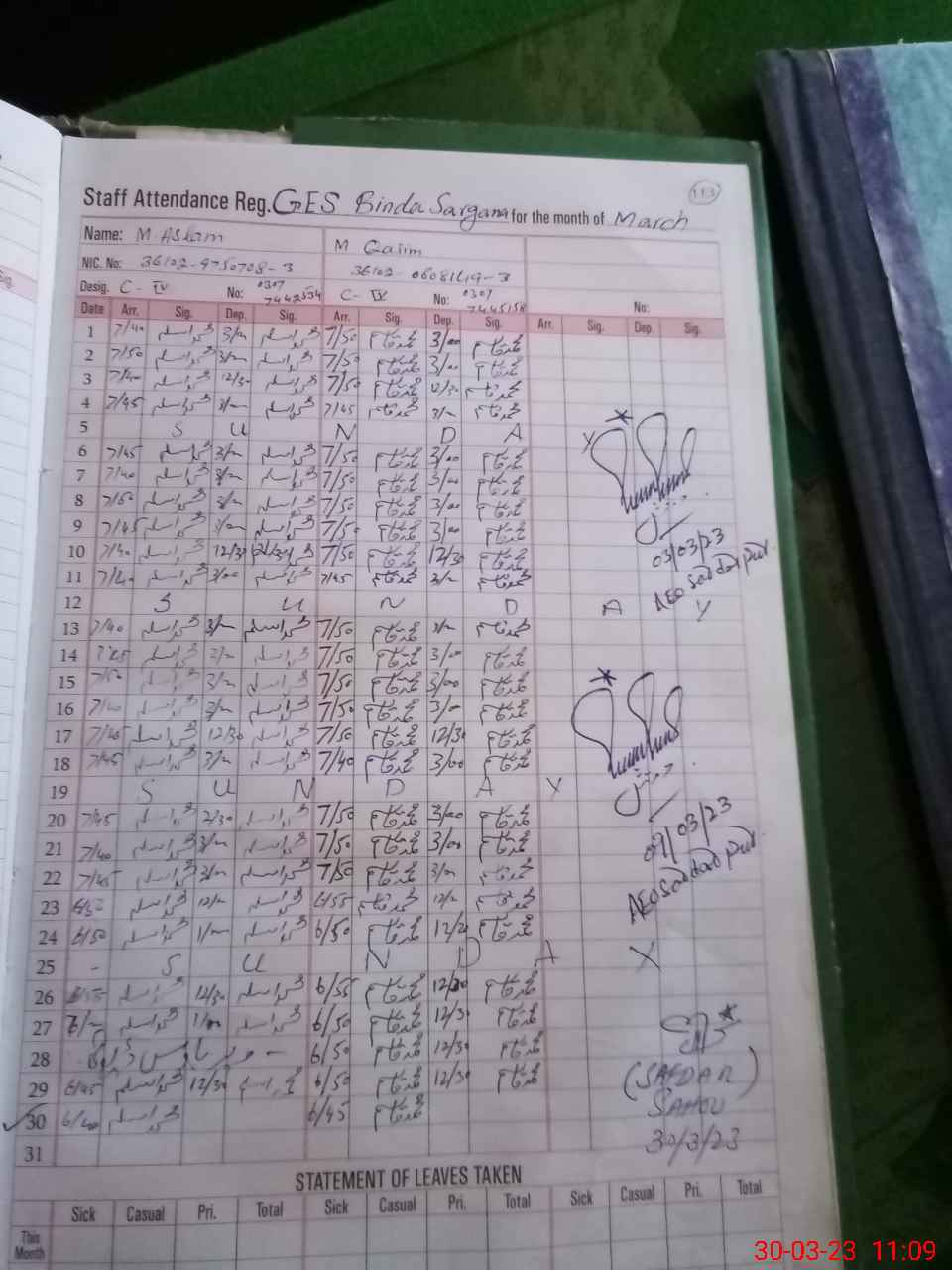 | CNIC | Full Name | Designation | R/C | Absence during last cal. month |