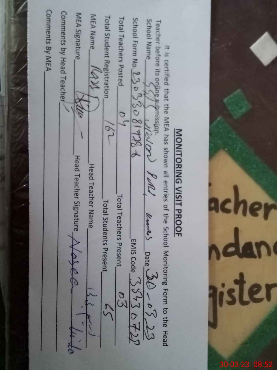 | Attendance Register | Head Teacher | MEA with School | Visit Proof |