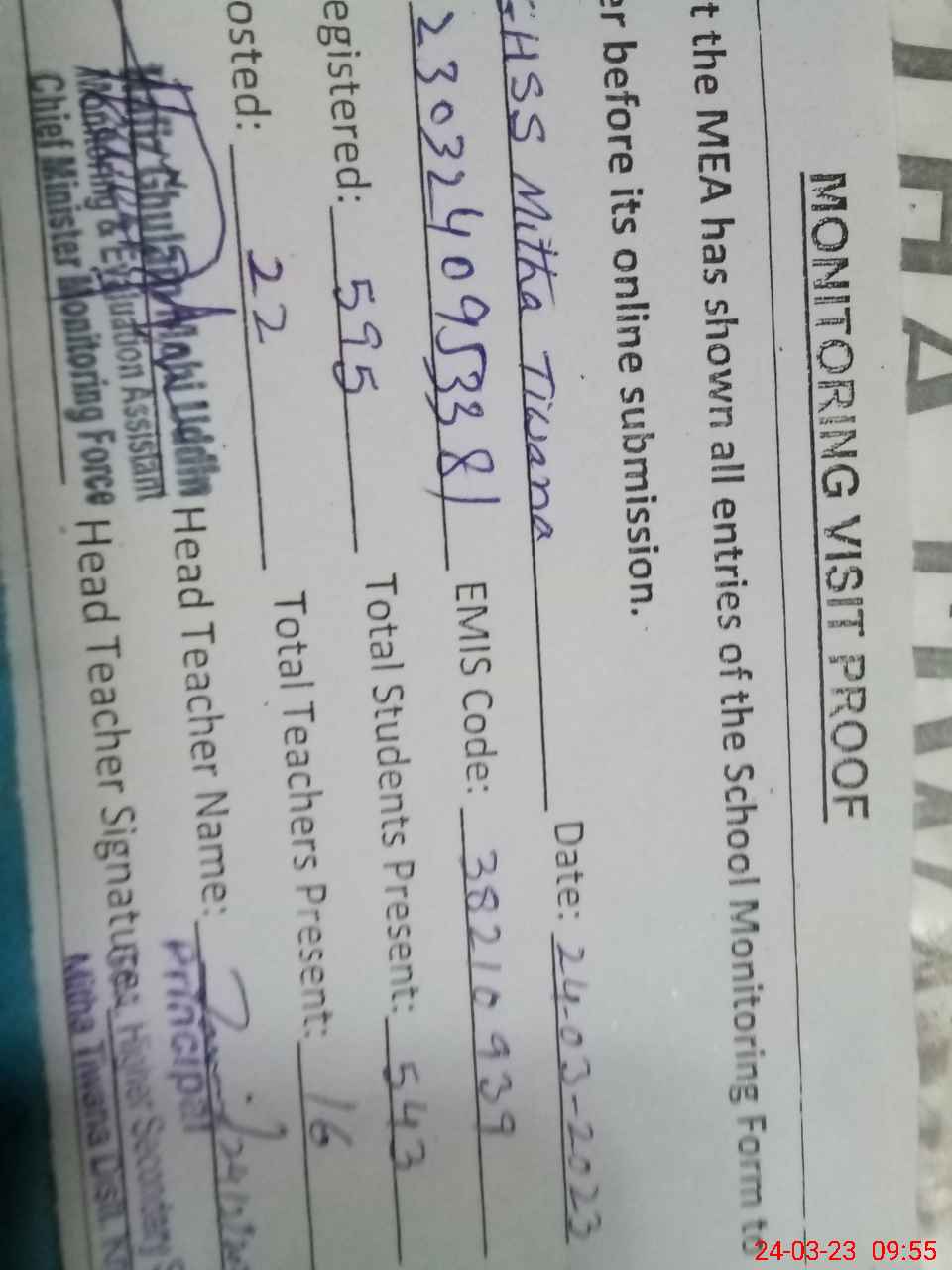 | Attendance Register | Head Teacher | MEA with School | Visit Proof |